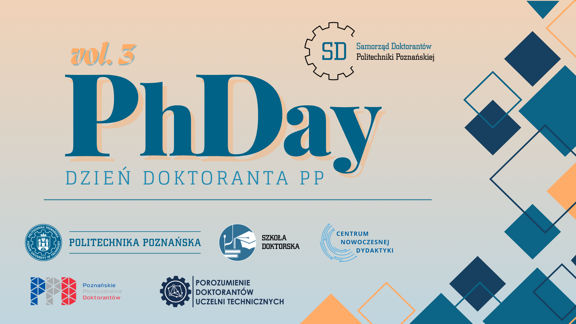 Samorząd Doktorantów Politechniki Poznańskiej wraz z Szkołą Doktorską serdecznie zapraszają na PhDay – Dzień Doktoranta PP vol. 3, który odbędzie się 10 października 2025 r. w sali L051 Centrum Wykładowego Politechniki Poznańskiej.