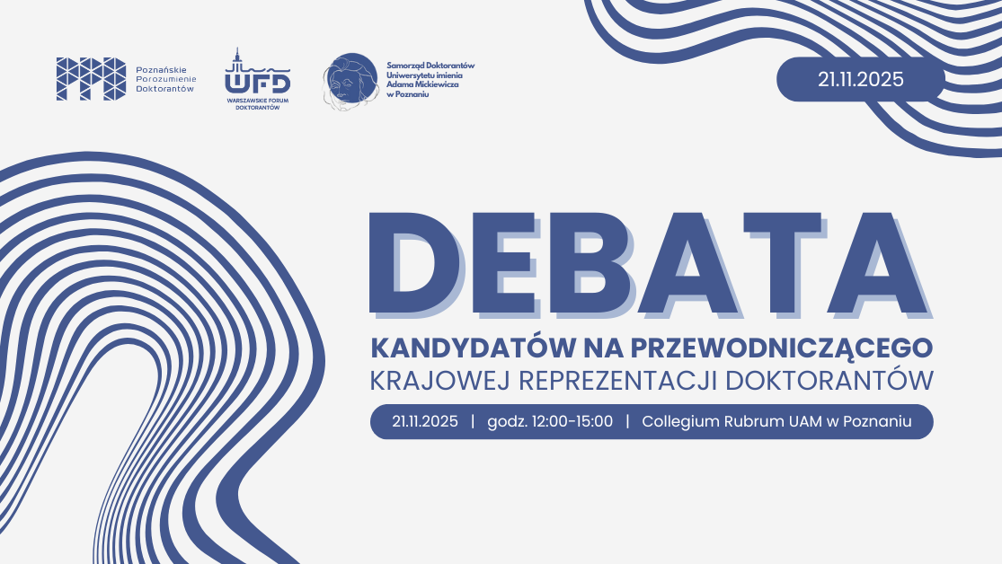 już w najbliższy piątek, 21 listopada 2025 r., odbędzie się Debata kandydatów na Przewodniczącego Krajowej Reprezentacji Doktorantów. Serdecznie zapraszamy do udziału, zarówno w formule stacjonarnej, jak i online.